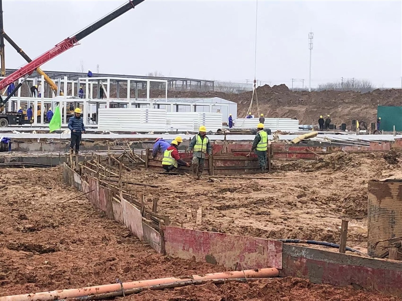 2月10日,農歷正月初十,大雪過后,地面泥濘。隔離區(qū)項目現場管理人員及施工人員精神抖擻、有條不紊地開展施工作業(yè),持續(xù)推進打包房、折疊房和板房的安裝,水電配套同步進行。