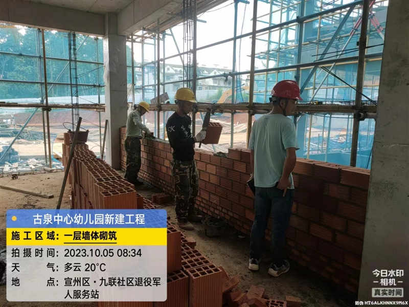 在宣州區(qū)古泉中心幼兒園項目,為了保障明年秋季招生,施工隊伍正在對一層墻體進(jìn)行砌筑。