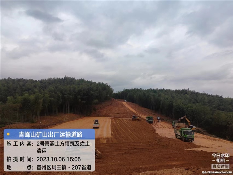 在青峰山礦山出廠運(yùn)輸?shù)缆讽椖可希旰筇鞖鉃榱吮U享椖抠|(zhì)量,現(xiàn)場機(jī)械正在對爛土進(jìn)行清運(yùn)。