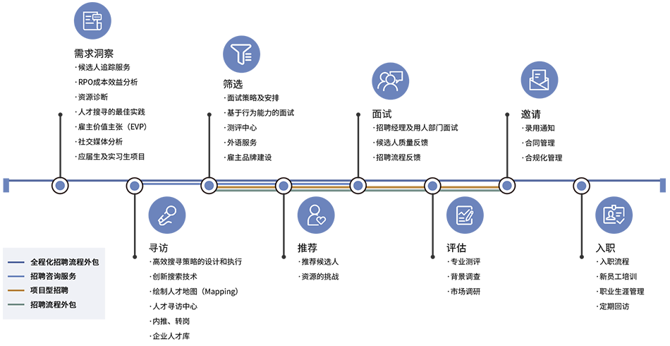 有針對性地提供部分或全流程招聘外包服務(wù)。作為一家專業(yè)的招聘流程外包服務(wù)商,我們旨在整合戰(zhàn)略、技術(shù)、資源及供應(yīng)商管理,以提供高效招聘流程服務(wù)。在服務(wù)過程中,我們將作為企業(yè)戰(zhàn)略合作伙伴與你的內(nèi)部團(tuán)隊(duì)緊密合作,通過流程設(shè)計(jì)、制定招聘戰(zhàn)略、人才尋訪、人才選拔、招聘決策、辦理入職、技術(shù)協(xié)調(diào)及核心業(yè)務(wù)數(shù)據(jù)的匯報(bào)等服務(wù),幫助企業(yè)提升招聘效率,提高招聘質(zhì)量,同時(shí)降低招聘成本。